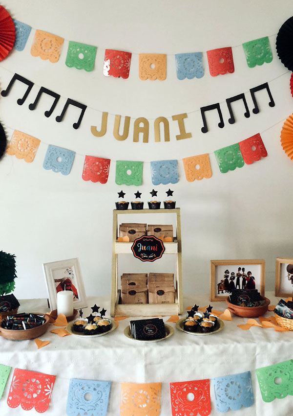 Deco pared: son cuatro rosetones de colores, guirnalda de feliz cumple con nombre. Dos banderines estilo mexicanos.