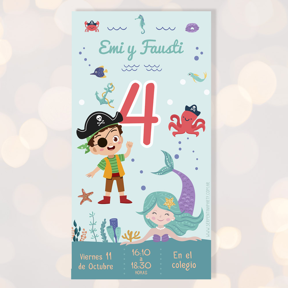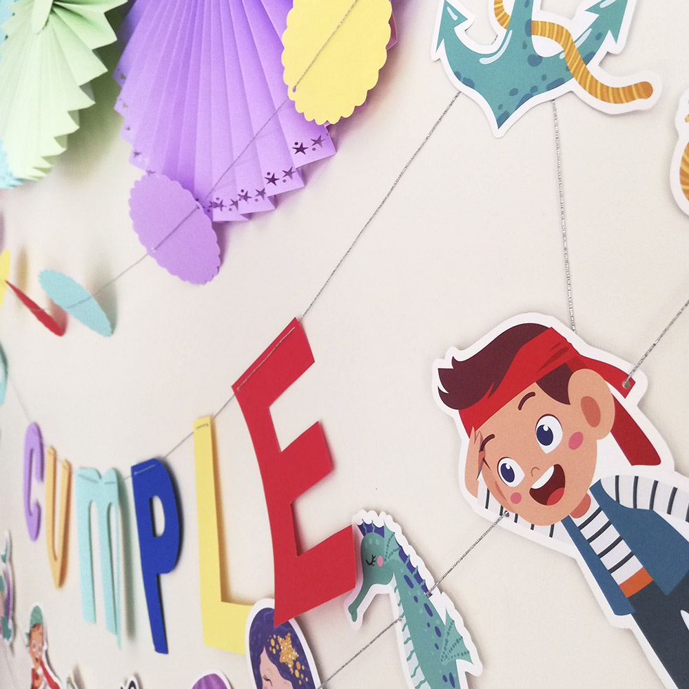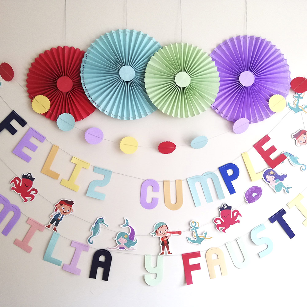 Deco pared: son cuatro rosetones de colores, guirnalda de feliz cumple con nombre, guirnalda con diseño de piratas y sirenas. Guirnalda de colores.