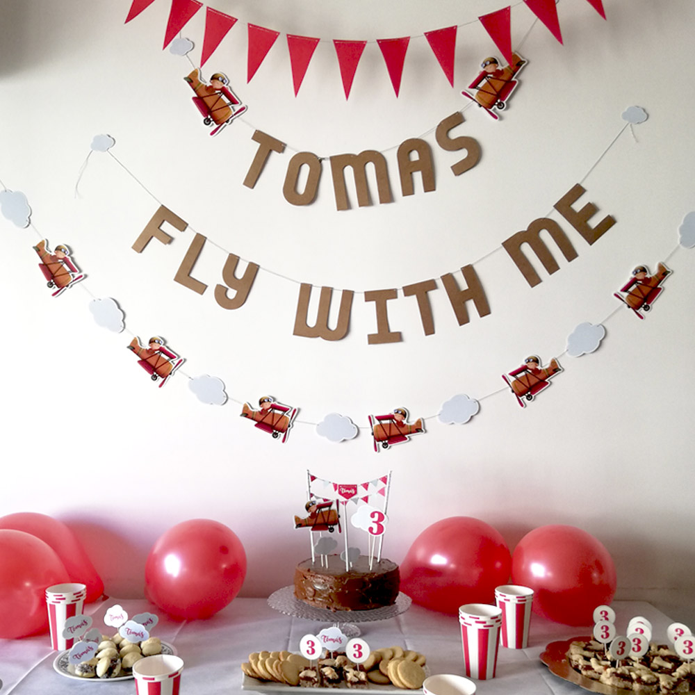 Deco pared: son cuatro rosetones de colores, guirnalda de feliz cumple con nombre, guirnalda con diseño impresa. Banderín de triángulos rojos.